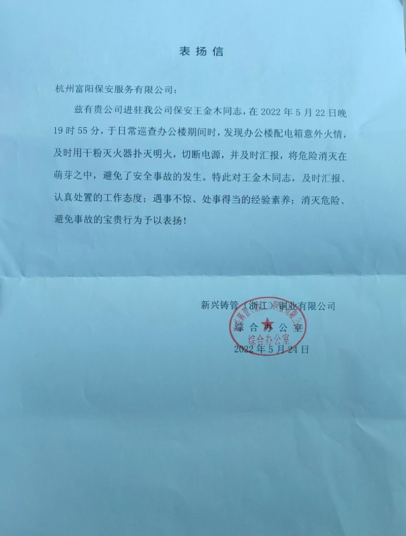 企业安保承担着保护园区内财产安全与人身安全,保安员王金木不仅做好了自己的本职工作,同时在日常巡逻中体现了职业水平,为企业的安全生产筑起了一道屏障。新兴铸管铜业有限公司领导得知此事后,大力赞扬我们保安员格尽职守、尽职尽责的工作态度,特意写了表扬信给保安公司,希望公司能够给予保安鼓励与奖赏,以此激发保安员的工作热情,弘扬保安精神。