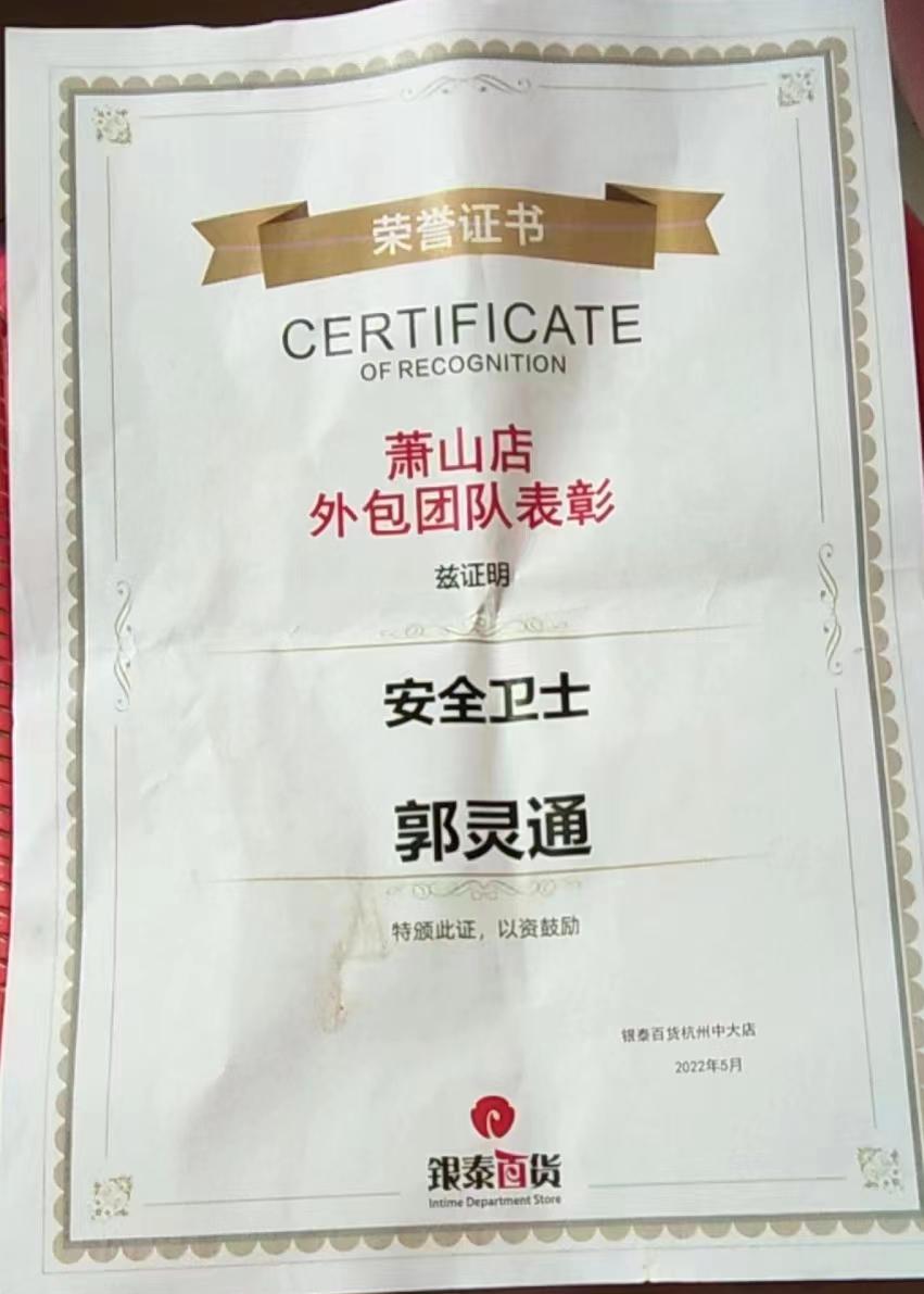 小事不小,积少成多。5月,我司驻银泰百货萧山店的队员郭灵通获得客户授予的“安全卫士 ”荣誉。这是因为该队员在工作中尽职尽责,把好安全关,他的荣誉从积累的点滴“细节 ”中来。