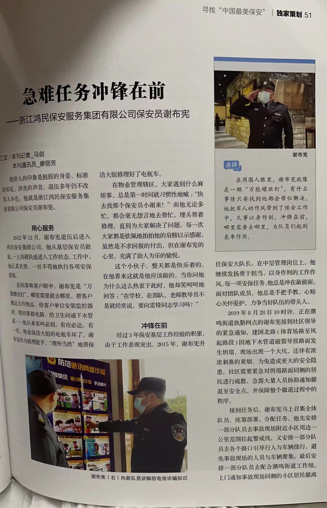 其中,集团公司老员工谢布宪同志赢得了最终头筹,谢队长的优秀事迹还被《中国保安》杂志“寻找中国最美保安”栏目刊登。就让我们用保安员行业赢得的这份荣誉和成绩,向党献礼。
