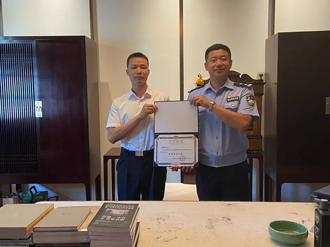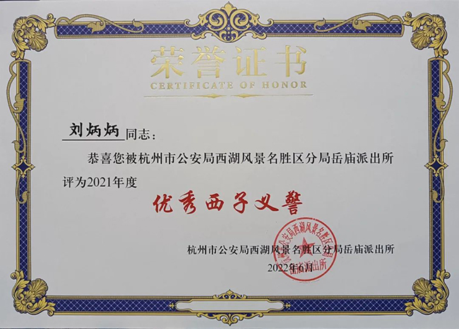 近日,杭州市安保集团驻省行政中心特保中队刘炳炳被杭州市公安局西湖景区岳庙派出所评为2021年度“优秀西子义警”,并颁发了“优秀西子义警”荣誉证书。