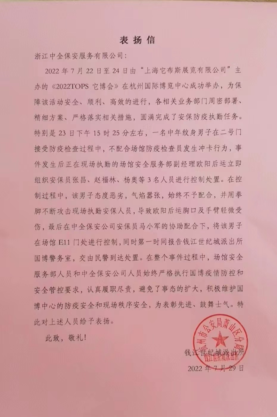 近日,浙江中全保安服务有限公司收到了一封来自杭州市公安局萧山区分局钱江世纪城派出所的表扬信,字里行间充满了对员工的认可与赞扬,对公司的肯定与鼓励。