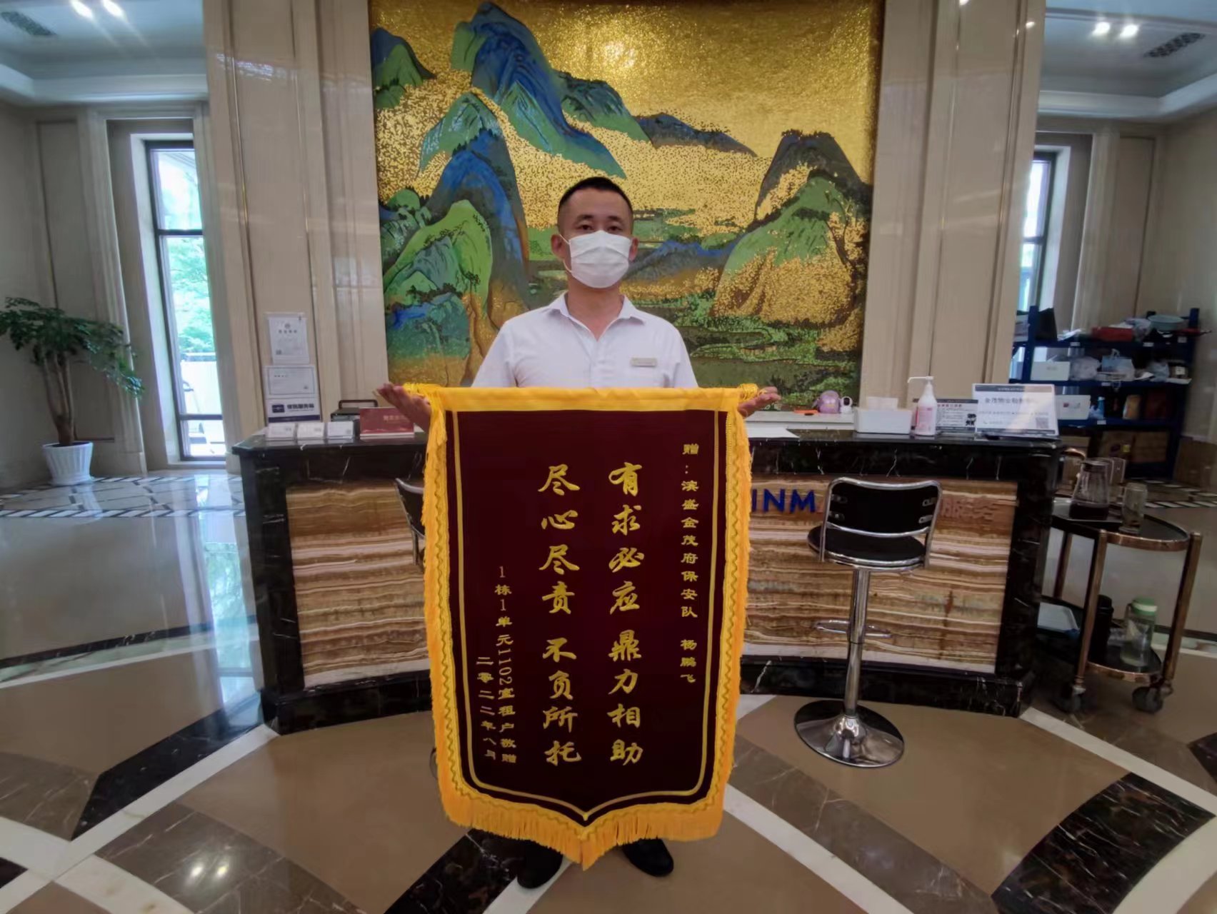 8月30号,滨盛金茂府保安团队收到一面绣有:“尽职尽责,不负所托,有求必应鼎力相助”的锦旗,对公司队员杨鹏飞为业主提供的帮助表示充分肯定和感谢!原来是在值班期间业主搬家进来,队员杨鹏飞带领巡逻岗不辞辛苦,任劳任怨,协助业主搬运家具至深夜,业主很是感动。
