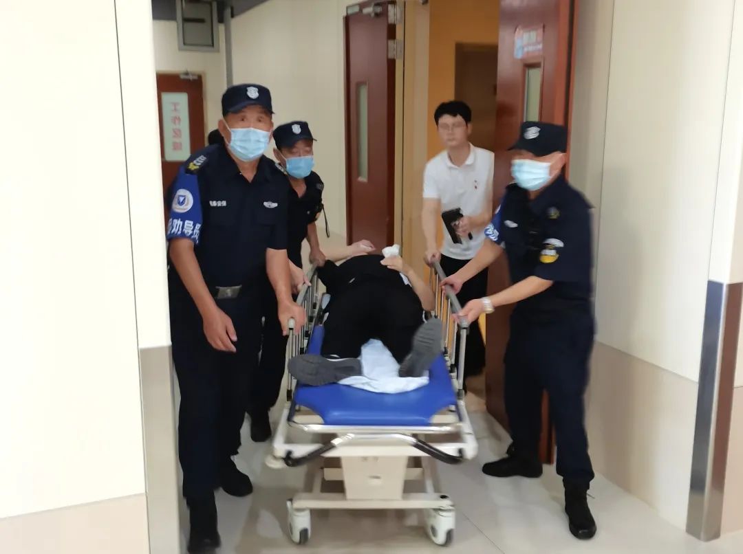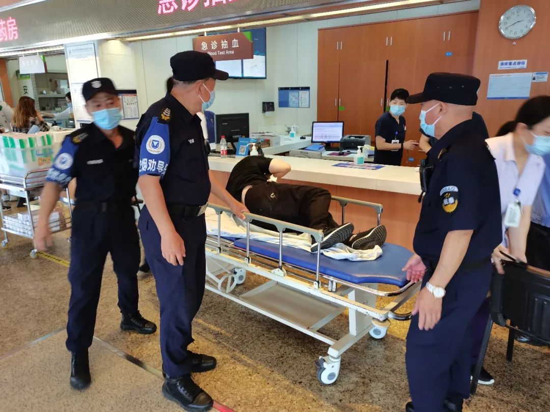 了解情况后,保安员胡长生立即跑去急诊推病床,并第一时间通知急诊预检台做好准备。保安员孙岩和杨龙持续呼叫病人,保证其意识清醒。胡长生把病床推到病人身边后,杨龙帮助病人拿随身物品,孙岩上前用一个大大的公主抱将病人抱上病床上,将病人安置好。病人安置好后,三名保安员火速将病人推往急诊抢救室,交给预检台护士紧急处理,并全程推着病人做检查和治疗。