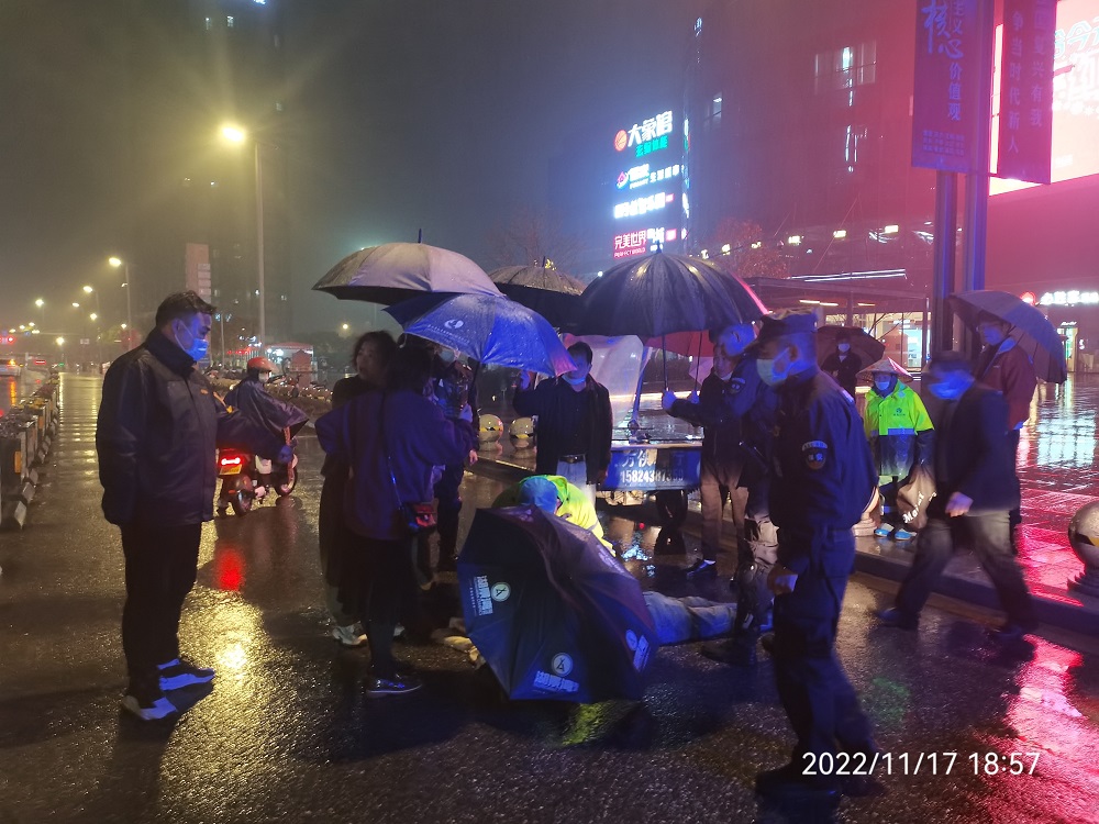 2022年11月17日晚18时许,黎峰保安队员李喜林和往日一样,在广场南侧的B大门例行值岗时,道路上突然传来“哐铛”的巨响和紧随而来的一阵起此彼伏的尖叫声引起了李喜林的警觉,李喜林立刻循着动静冲过去查看,只见路口一辆三轮车前,正躺着一名不断呻吟的男子,身后一滩深红色血迹。发现情况严重,李喜林立刻拨打了110和120,并随即向队长报告并申请支援。
