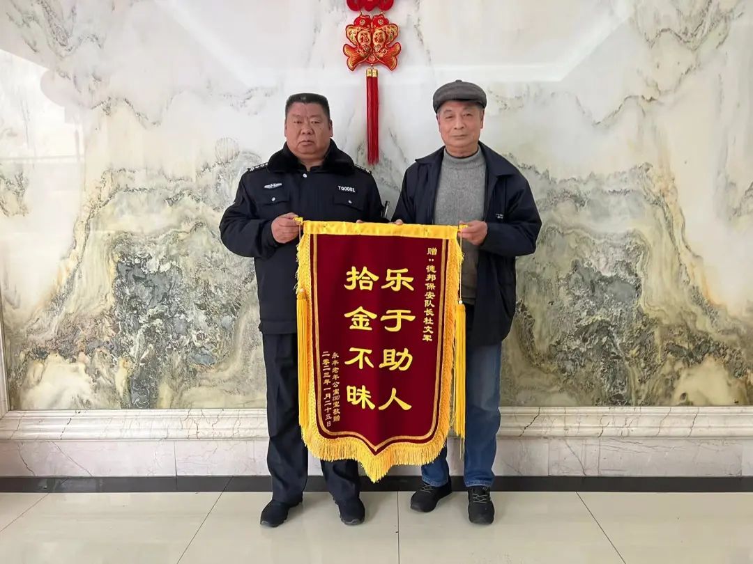 “我来送锦旗的。”今天,浙江德邦保安服务有限公司驻永丰老年公寓办公室迎来了居民胡大伯,拿着“拾金不昧 乐于助人”的锦旗,找保安队长杜文军。