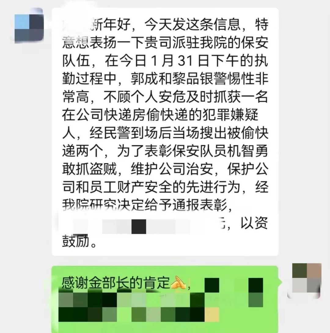 1月31日下午在正常执勤过程中郭成和黎品银两名队员走过快递房时,发现一名男子左顾右盼、行为诡异。两人提高警觉立即上前询问发现男子神色紧张,语言逻辑混乱,面对队员的续盘问,男子招架不住,见势不妙试图逃跑。经过几番周旋,两名队员成功将男子制服,交至警察手中,当场确认男子为盗窃嫌疑人。