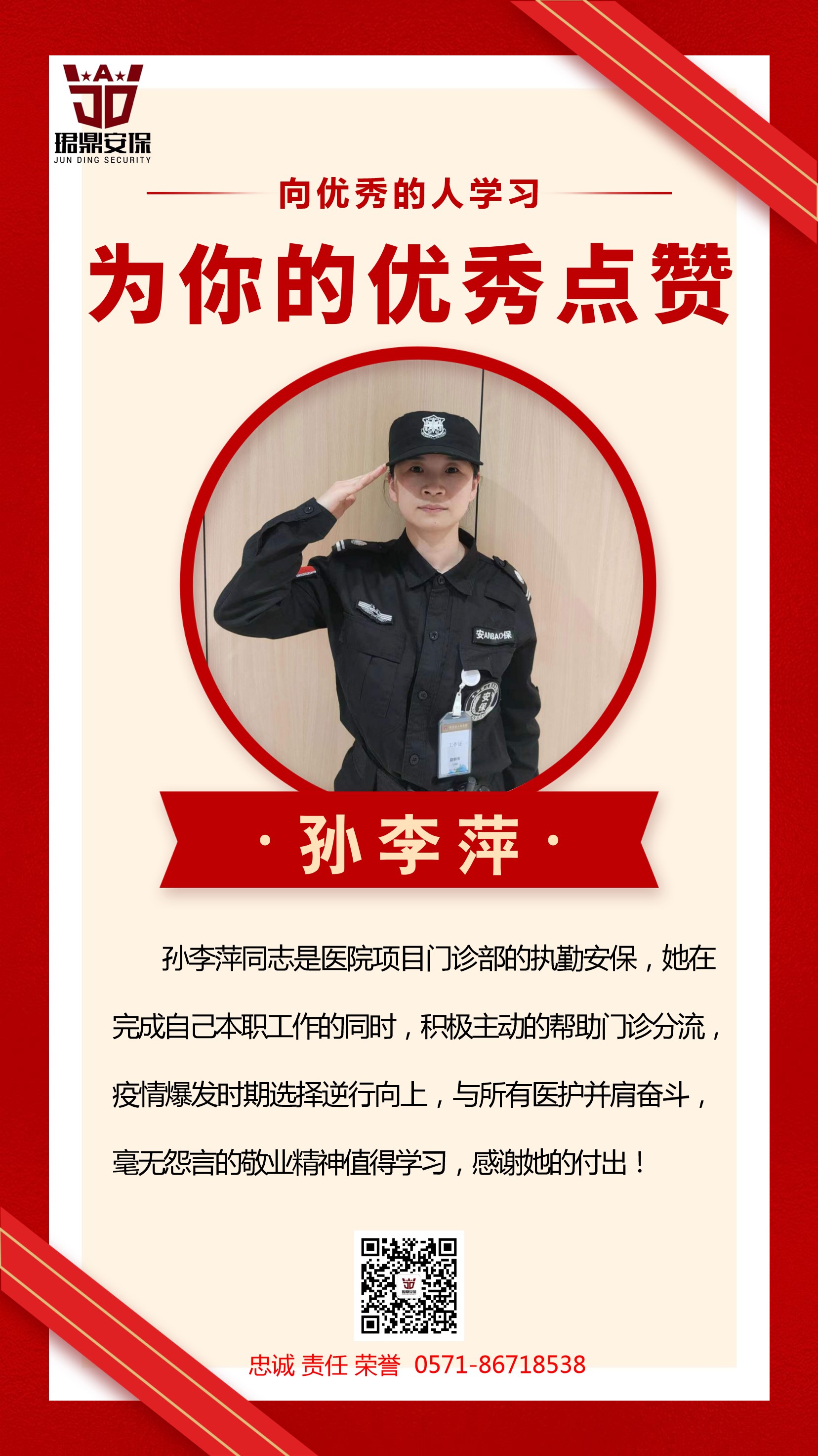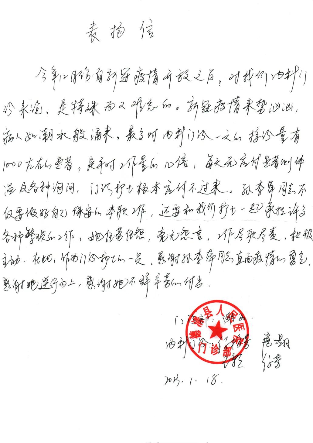 2022年12月,新冠疫情开放之后,来医院内科门诊就诊的人数急剧增加,是平时工作量的几倍,每天光应付患者测体温及各种询问,门诊护士根本应付不过来。孙李萍在做好保安本职工作的同时,主动承担了许多护士各种繁琐的工作,任劳任怨,积极主动,尽职尽责。