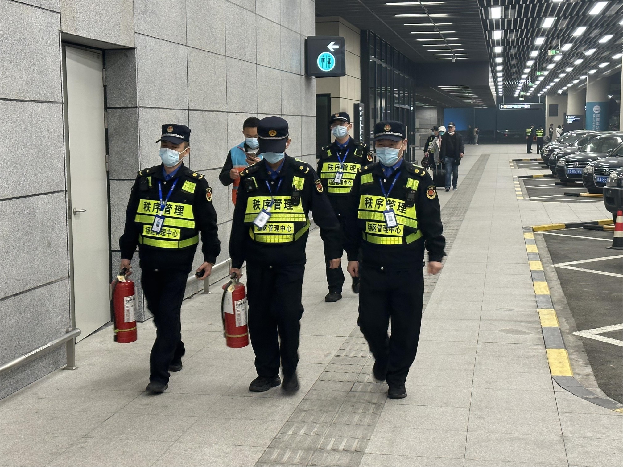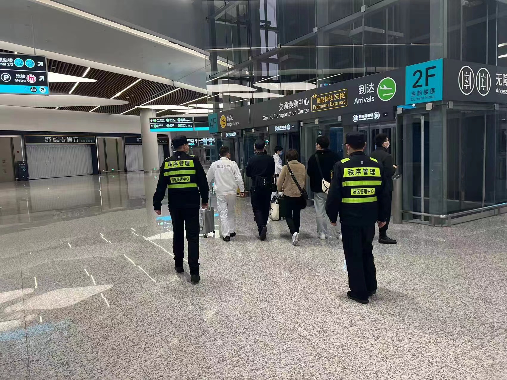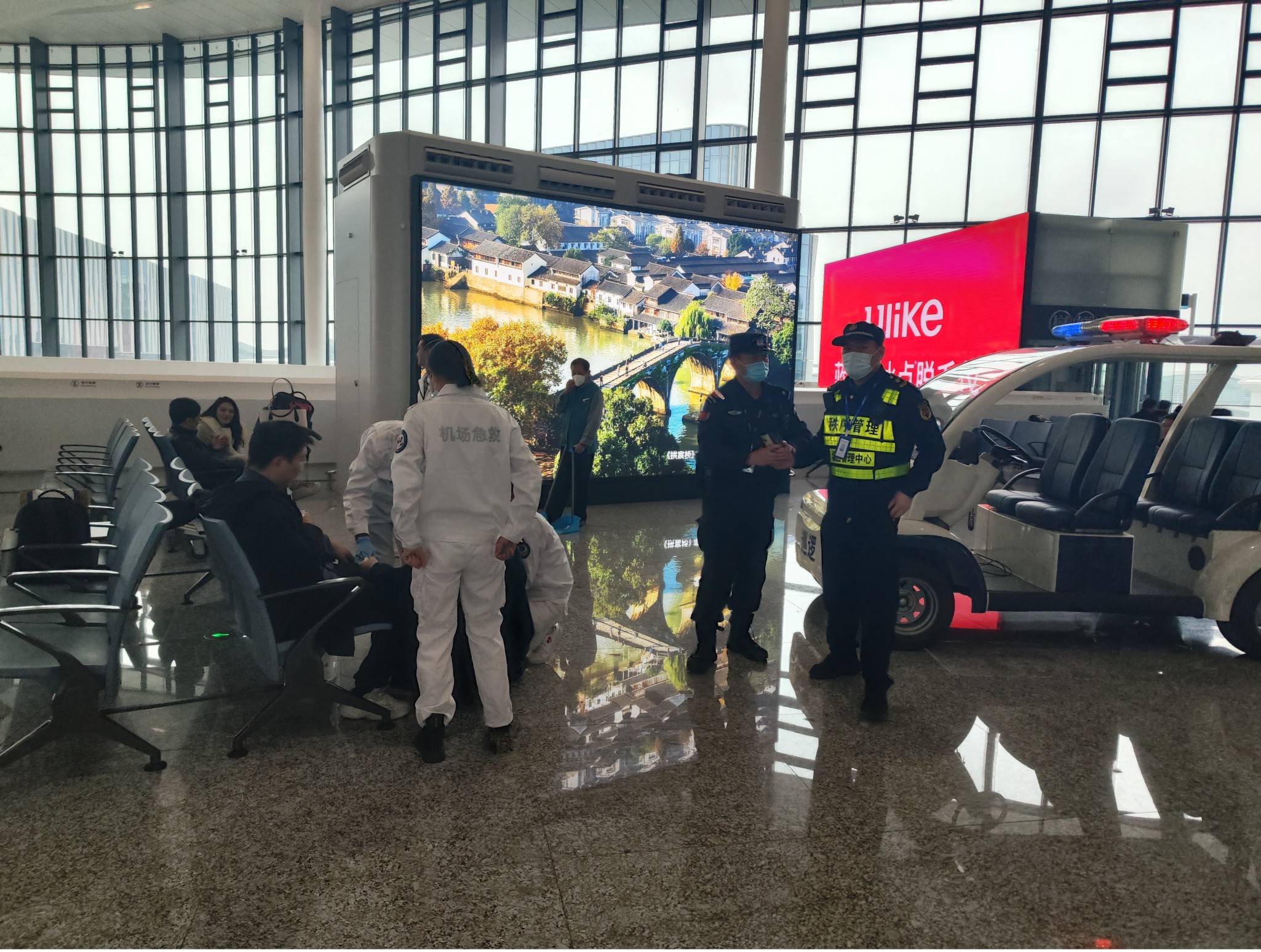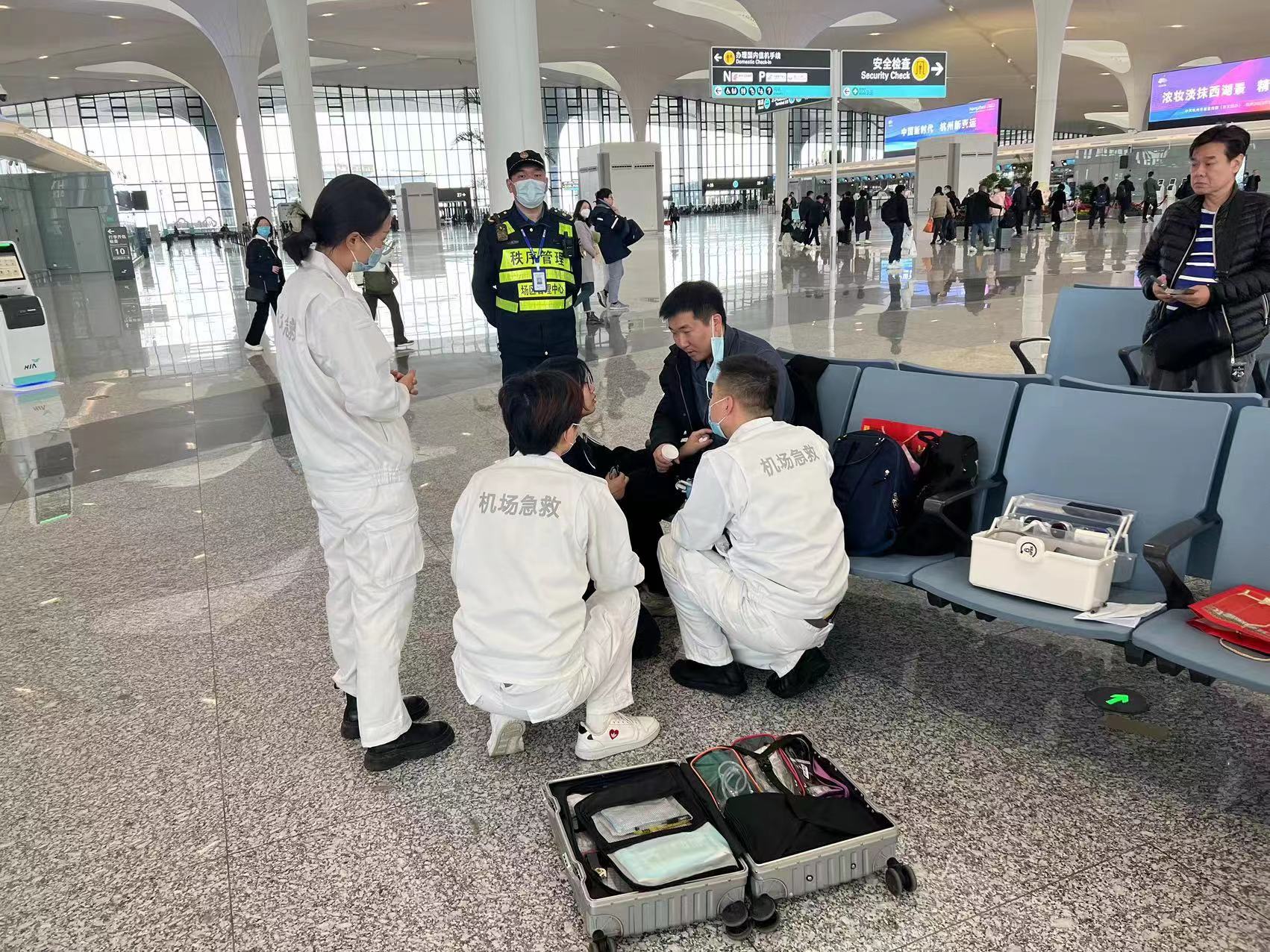 (图为3月24日上午,红鼎安保队员在发现旅客身体不适后,及时通知机场救户人员,并为机场救护人员维序)