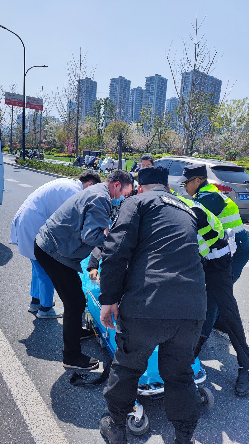 在等待120救护的过程中,老人神志清醒,但表情十分痛苦,嘴里不住地喊着“哎呦哎呦”,嘴唇也开始微微发白。为避免老人双腿因为受到长时间压迫而造成更大的伤害,在场安保人员当即决定抬车救人。执勤点位民警联合6名保安,合力将越野车和电动车先后抬起,不到一分钟便移除了老人身上的重压。待医护人员赶到,安保人员又协助医生将老人抬上担架,之后便迅速返回到各自的工作岗位,继续为半马保驾护航。