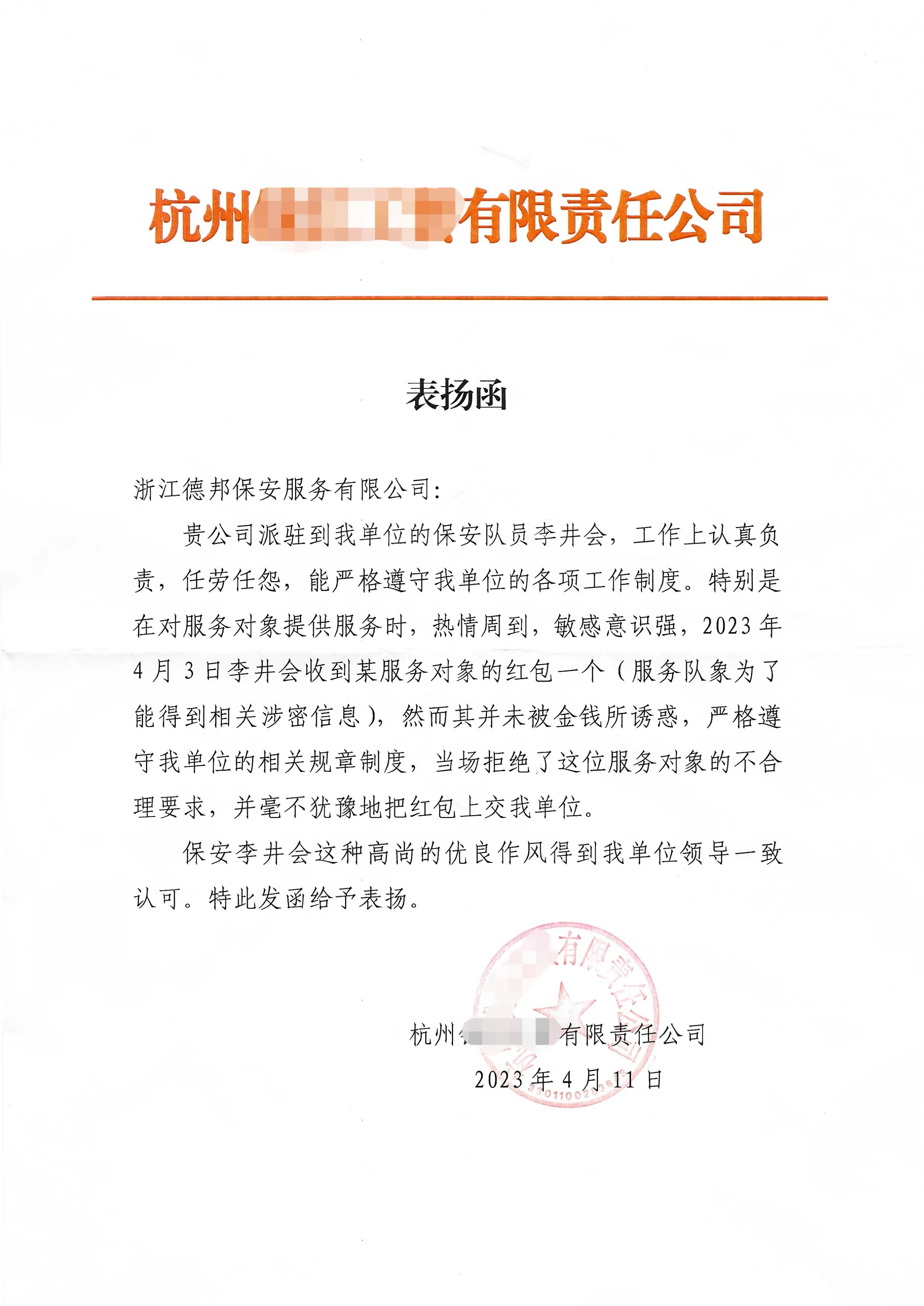 事后,客户单位特致表扬函给浙江德邦保安服务有限公司,对李井会同志工作认真负责、任劳任怨,不为金钱诱惑的职业道德操守提出表扬。
