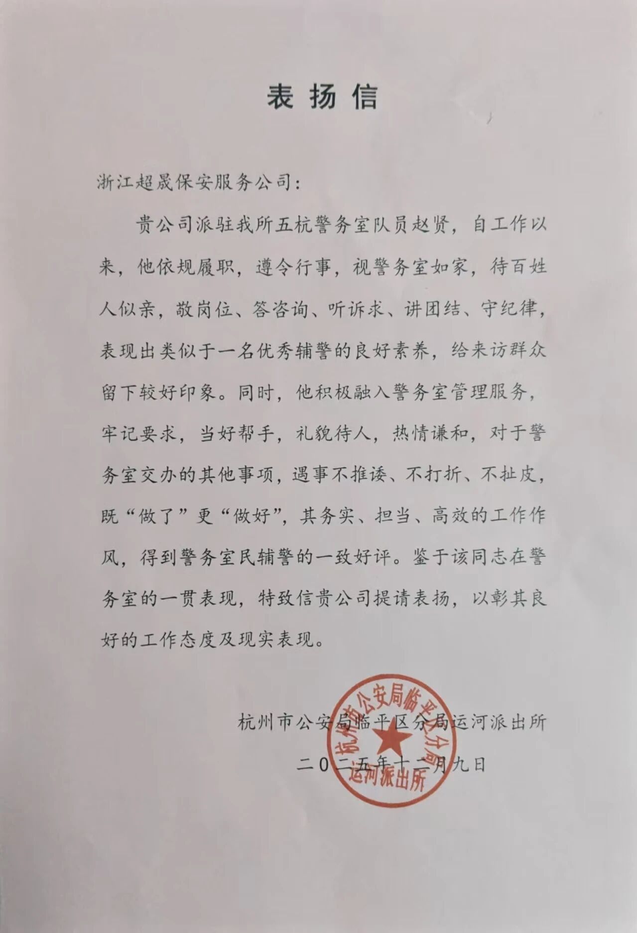 12月9日,浙江超晟公司驻杭州市临平区运河派出所辅助项目收到一封运河派出所的表扬信,信中充分肯定了公司员工赵贤出色的工作表现。