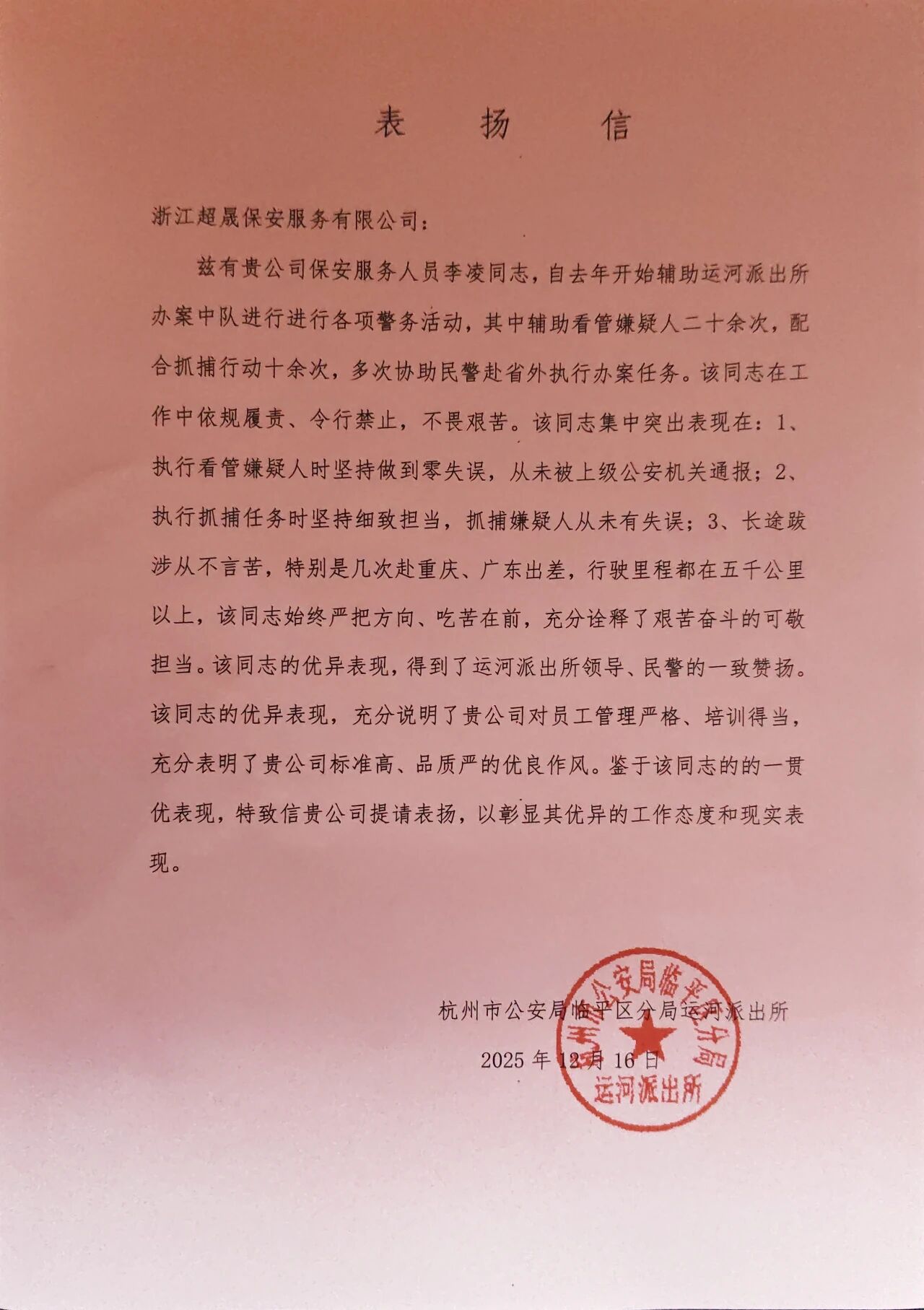 12月16日,浙江超晟公司驻杭州市临平区运河派出所辅助项目收到一封运河派出所的表扬信,信中表扬了公司员工李凌出色的工作表现。