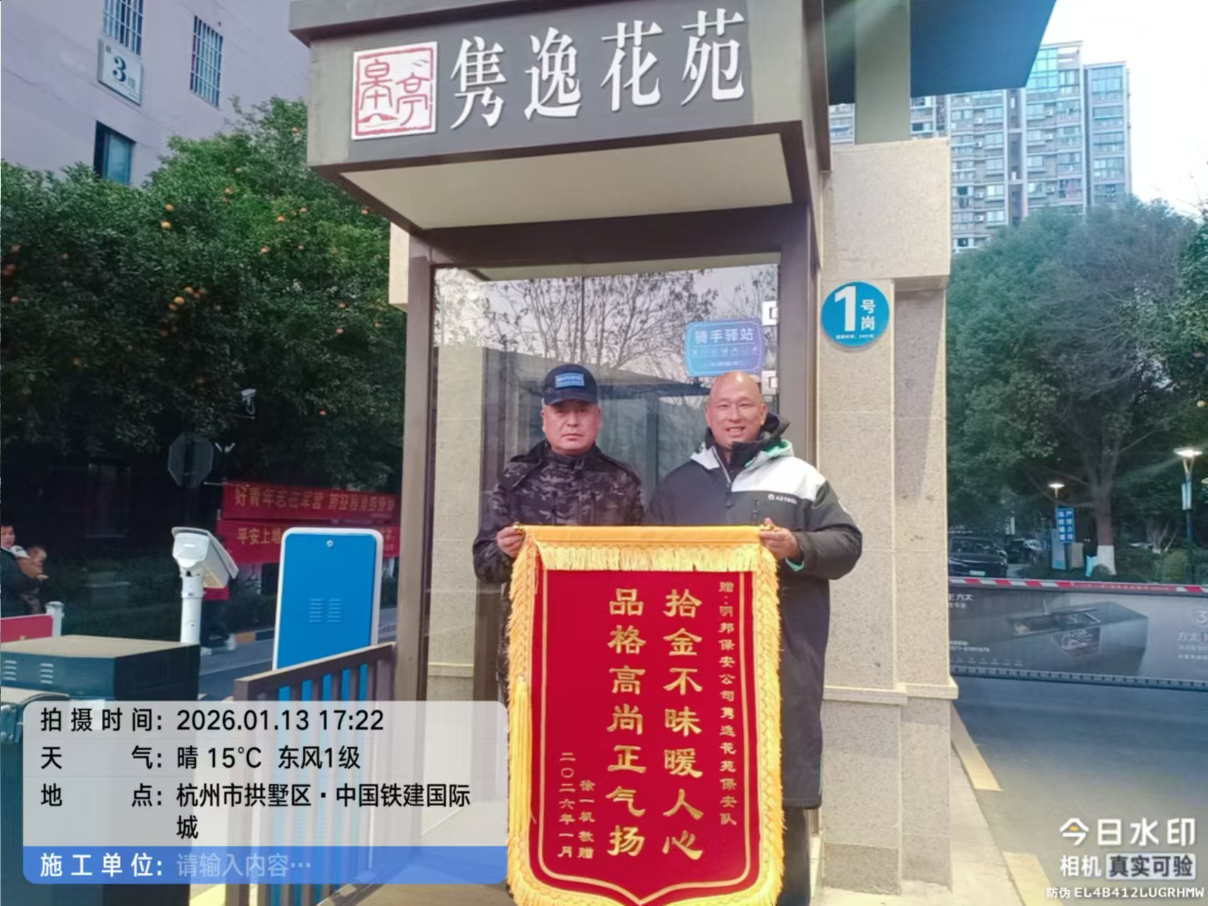 1 月 13 日,业主特意送来一面写着 “拾金不昧暖人心,品格高尚正气扬” 的锦旗,在隽逸花苑的门岗前,把这份谢意稳稳交到了保安手中。