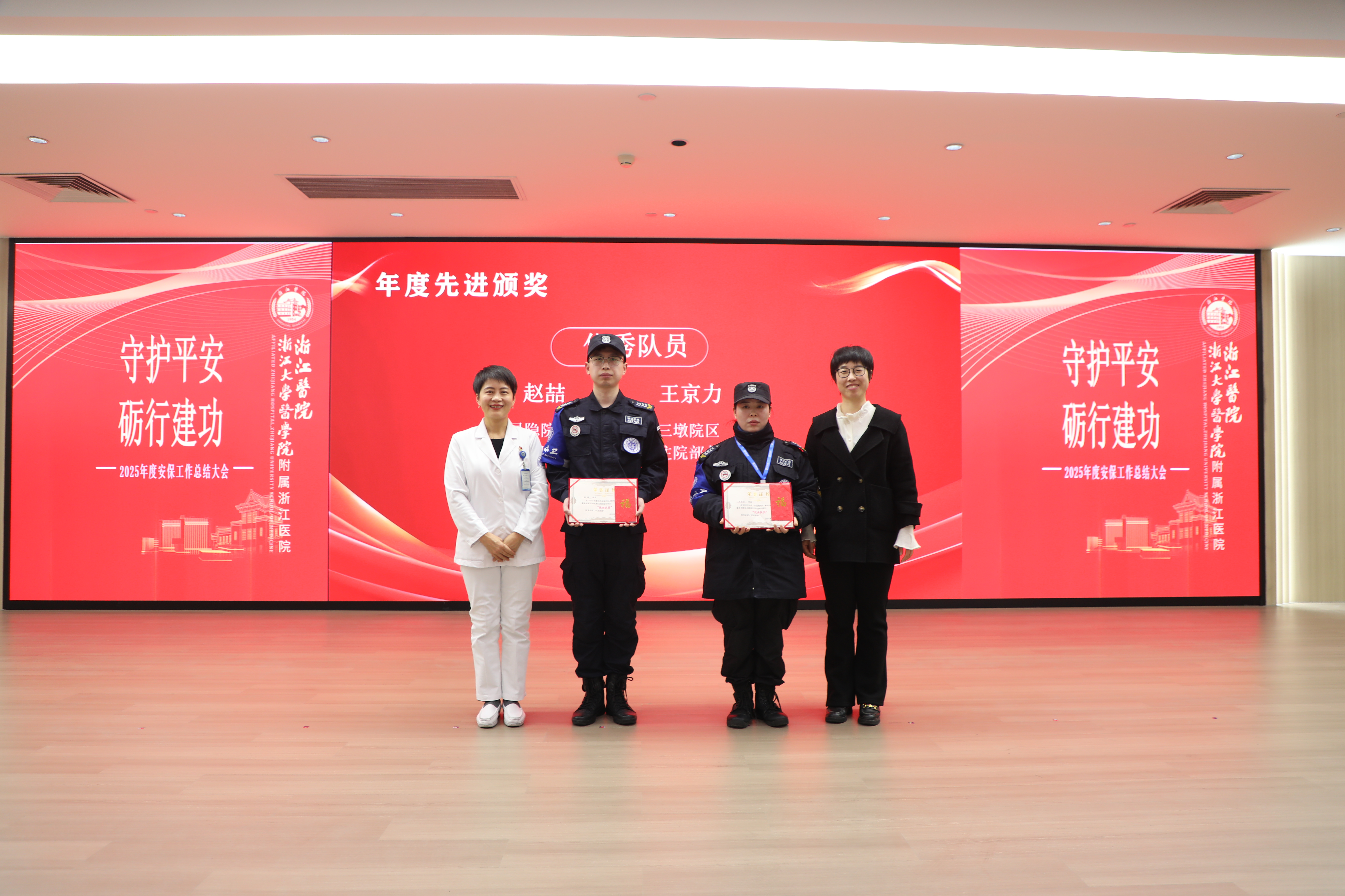 因多次主动担当、温情服务,王京力在浙江医院 2025 年度安保工作总结大会上获评 “年度优秀队员”,成为全队优秀典范。这张颁奖照片,定格的不仅是荣誉,更是她 “守护平安、砺行建功” 的日常坚守。