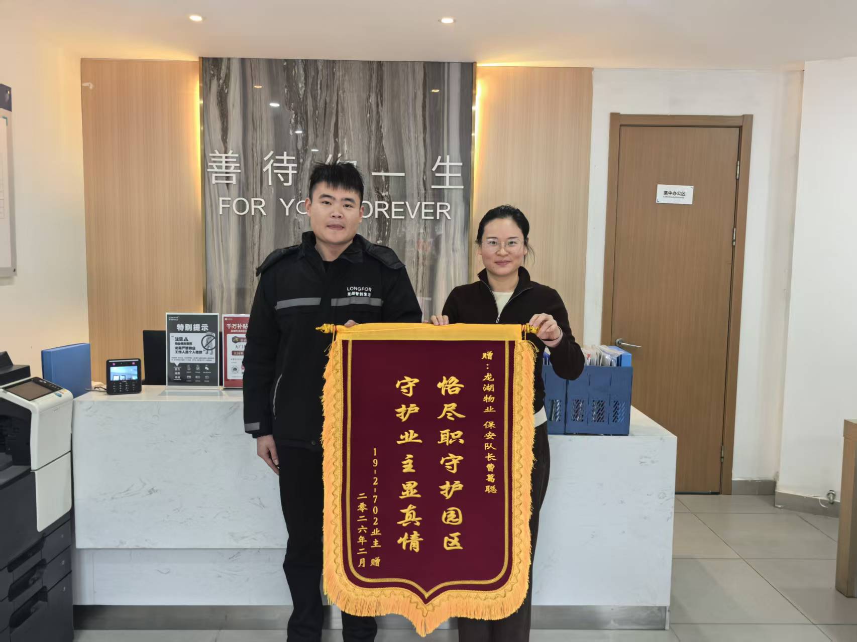 近日,明邦保安驻龙湖项目秩序队员曹葛聪收到了一份特别的礼物—— 来自 19-2-某业主亲手赠送的锦旗。鲜红的锦旗、烫金的字迹,不仅是一份荣誉,更是业主对我们安保工作最真挚的肯定与赞誉。