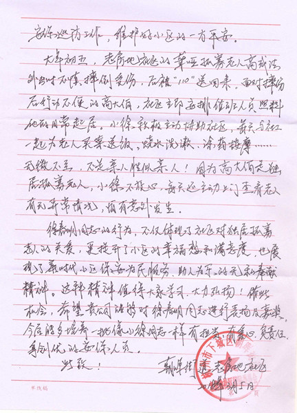 2018年3月5日,公司收到一封来自老房地社区居委会的表扬信,表扬保安徐春明在春节期间,协助社区热心照顾聋哑孤寡老人高成法的感人事迹。