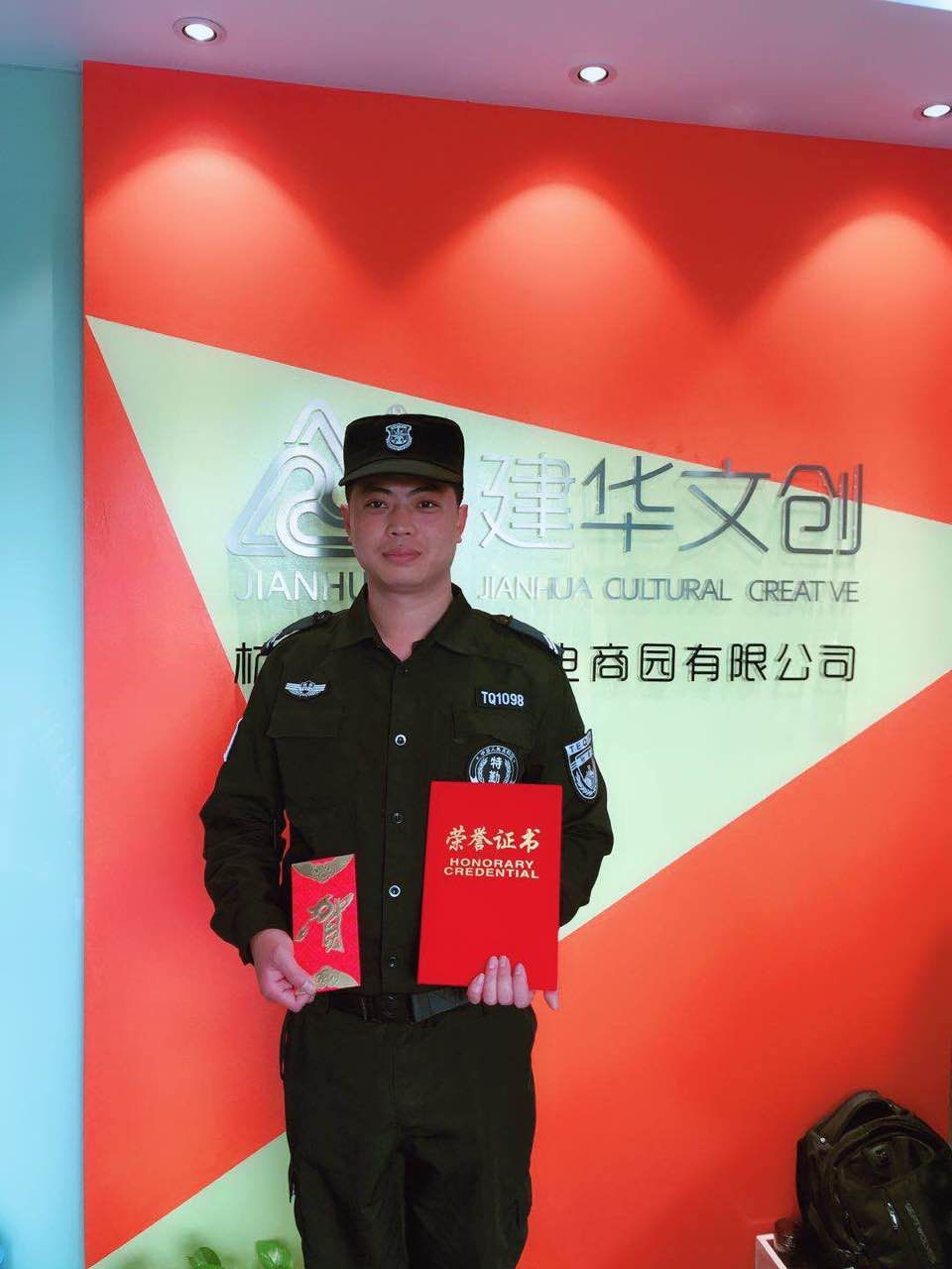 杭州拱墅保安服务公司驻杭州建华文创集团股份有限公司保安员范庆威同志,在“317”消防栓内压力表爆管事件中,不顾个人安危,用手死死堵住缺口,并及时上报属地工程部,最大程度地降低了园区及业主的损失。拱墅保安认真负责的工作态度获得了服务单位领导的高度评价与肯定,范庆威同志更是被杭州建华文创集团股份有限公司授予“忠诚卫士”称号并颁发了证书和奖励。