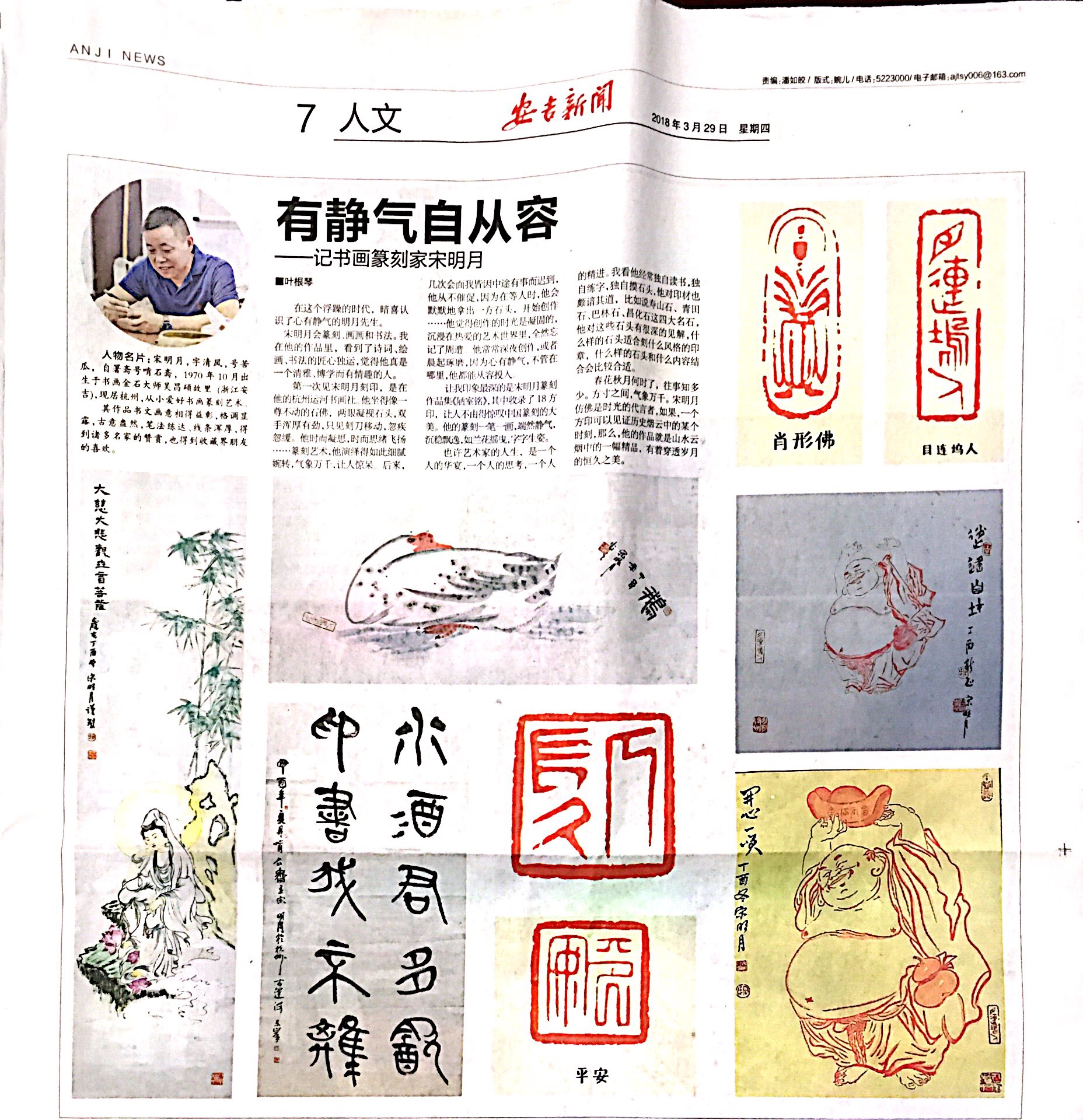杭州拱墅保安服务公司犬防大队长宋明月,是公司有名的“苦瓜大师”,会篆刻、画画和书法,是一个端方、细腻而有趣的人。近日,宋明月登上《安吉新闻报》人文版块,被评价:“有静气自从容”。
