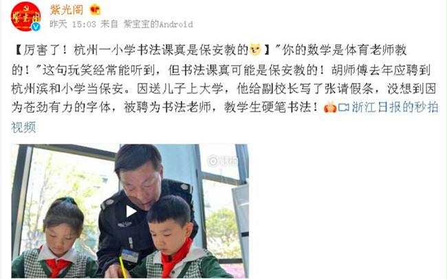 "你的数学是体育老师教的!"这句玩笑经常能听到,但书法课真可能是保安教的!杭州市安保服务集团有限公司保安二部驻杭州滨和小学保安员胡禄喜去年因送儿子上大学,他给副校长写了张请假条,没想到因为苍劲有力的字体,被聘为书法老师,教学生硬笔书法!他的事迹被中央和国家机关工作委员会《紫光阁》杂志社的认证微博紫光阁转发。