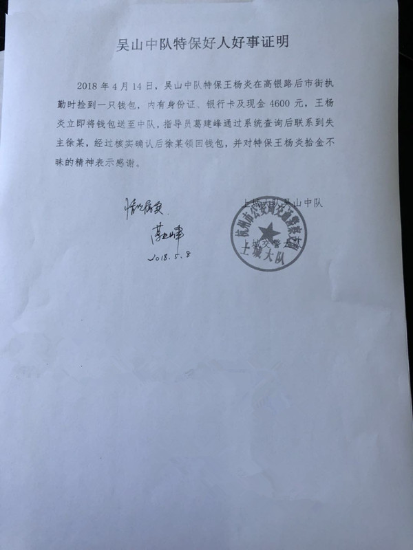 2018年4月14日,杭州上城保安驻吴山中队特保王杨炎在高银路后市街例行巡查时捡到一只钱包,内有身份证、银行卡及现金;环顾四周并没有发现失主,王杨炎没有多想,立即将钱包上交到中队存放并向上级领导汇报了此事,后在中队指导员的帮助下联系到失主并将钱包归还,得到了失主及中队的表扬。