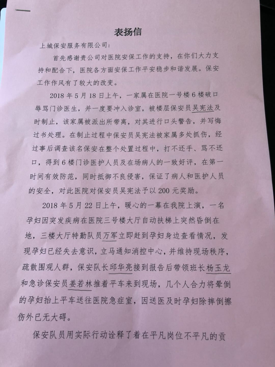 2018年5月22日上午,暖心的一幕在浙江大学医学院附属妇产科医院上演,一名孕妇突发疾病在医院三号楼大厅自动扶梯上晕倒,我司队员万军立即赶到孕妇身边查看情况,发现其已失去意识,万军立即通知消控中心,并维持现场秩序,疏散人群;保安队长邱华亮接到报告后带领队员杨玉龙、姜若林推着平车赶到现场,几人合力将晕倒孕妇台上平车送往急诊室,因送医及时该孕妇已无大碍。