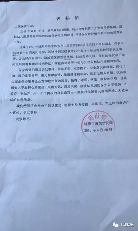 暴雨肆虐祸非轻,洪水无情人有情。三名保安员的无私奉献、不畏艰难的品行得到了幼儿园的高度赞扬。