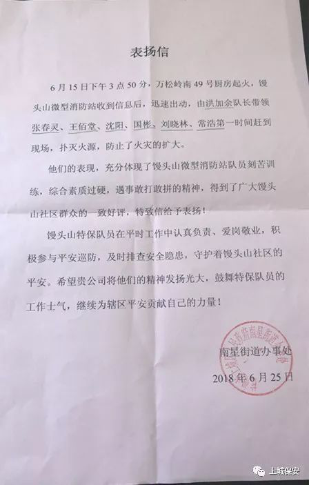 2018年6月,万松岭南49号厨房起火,我司派驻馒头山微型消防站队员在队长洪加余的带领下,第一时间赶赴现场,扑灭火源,将火灾控制在萌芽状态。几位队员的英勇表现,与平日的训练密不可分,他们的认真负责、爱岗敬业的精神,值得我们大家的学习。
