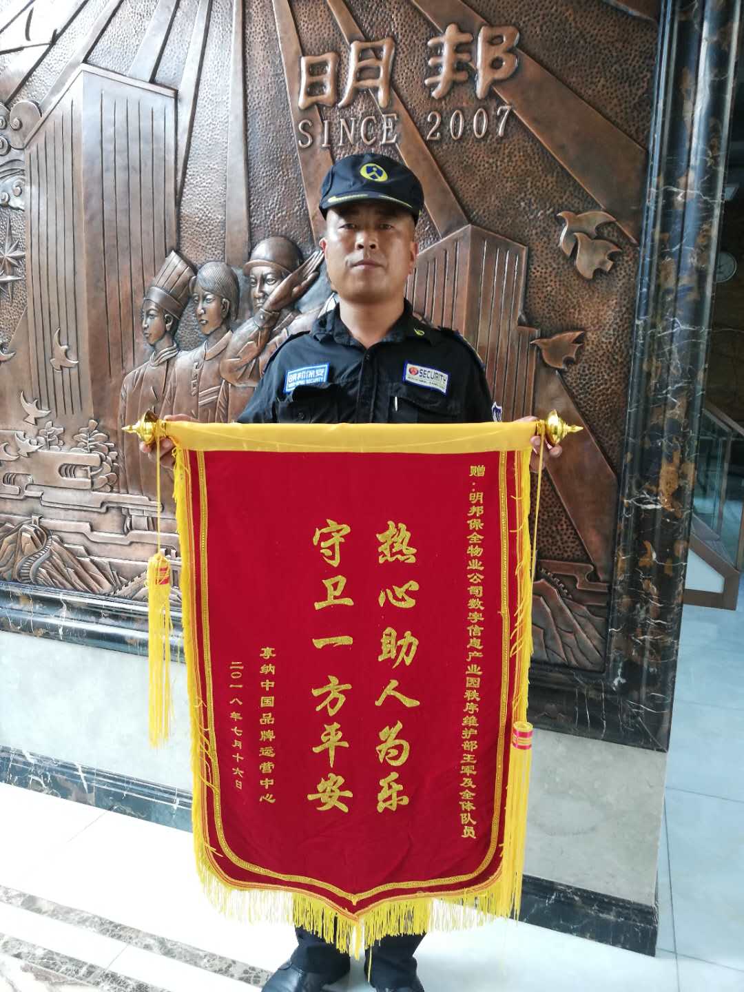 公司驻杭州数字信息产业园保安队,收到亭纳中国品牌营运中心专门送来的一面印有“热心助人为乐,守卫一方平安”的锦旗,对我公司热心助人的保安队的表示感谢。