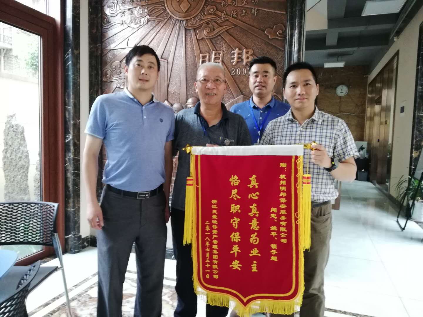 2018年8月3日上午11时客户单位天堂硅谷管理集团领导亲自将一面印有“真心实意为业主,格尽职守保平安”的锦旗送到杭州明邦保安公司。