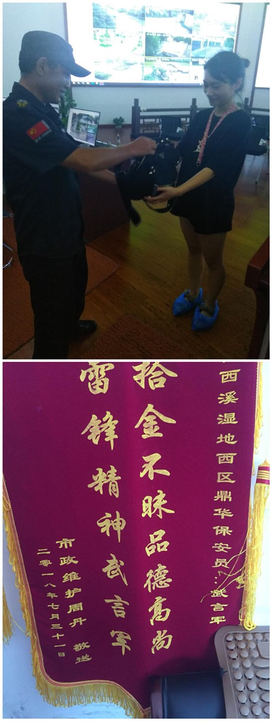 2018年7月31日,杭州鼎华保安公司的保安武言军在巡查西溪湿地西区方塘附近治安状况时,捡到一个黑色背包。保安员武言军耐心地在原地等候了十余分钟,未有失主前来认领,于是用对讲机和队长联系,拿回保安室。为方便联系失主,仔细翻看发现背包里面有一部手机、身份证、银行卡、市民卡若干张和现金4000余元。于是队长一边指挥消控室人员广播,一边通过警务室查找联系。
