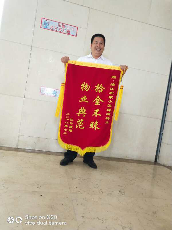 收到这面锦旗是业主对我们物业和保安队工作的认可,这也意味着以后的工作更多了一份责任。在以后的工作里全体队员都要树立拾金不昧的品质,全心全意为业主服务,从小事做起,从点滴做起,让每位业主感受到家的温馨。