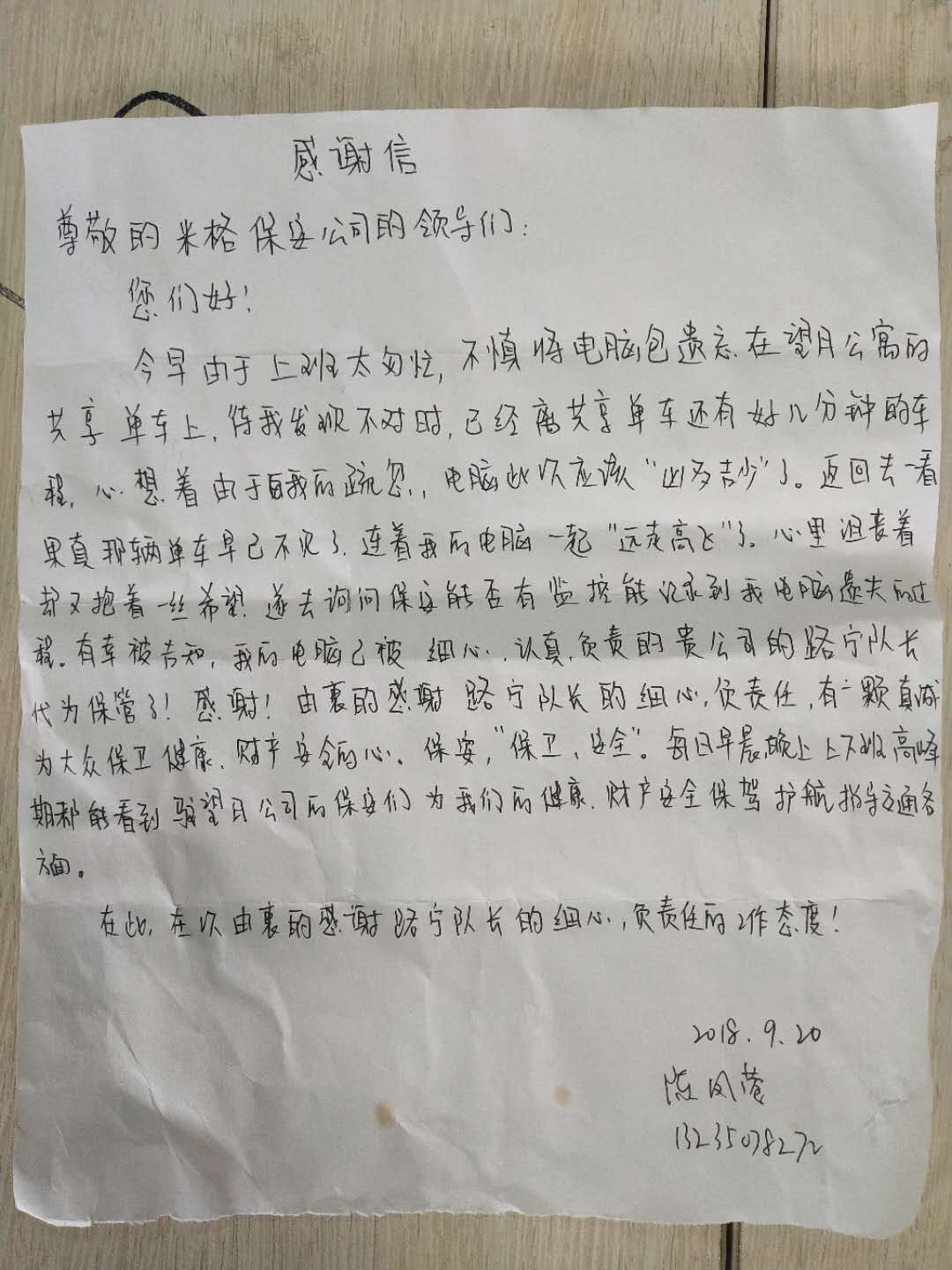 9月20日早晨,路宁班长照常巡逻,细心的他一眼发现了共享单车上的黑色电脑包,他第一时间走过去,发现周围并没有人,猜想此电脑包的主人应该是走的太匆忙给落下的,因此并将电脑包取回放置保安岗亭,等待失主回来认领。没过一会,就发现一个女孩前来询问门岗要调看监控,查看电脑包的去向。门岗保安员向她说明事件原委,表示电脑包并没有丢失,得知情况的失主表示非常感谢路宁班长,并亲手写下感谢信。