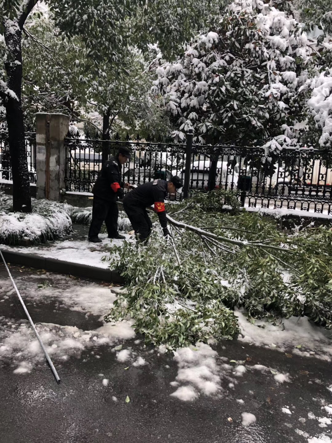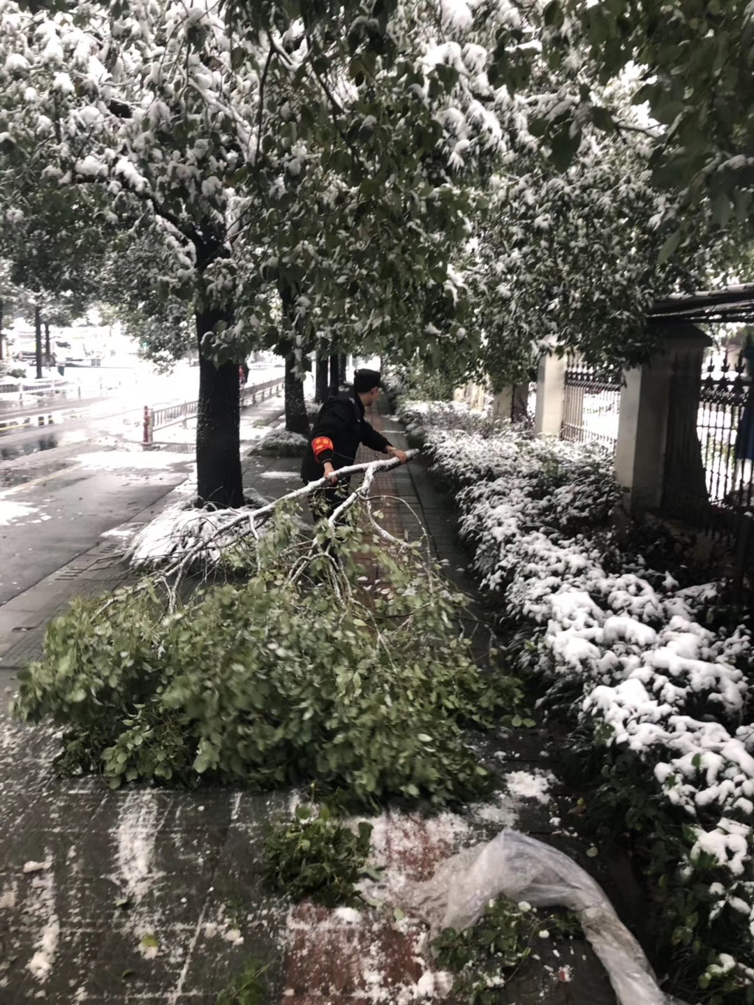 次日凌晨,拱墅保安就启动扫雪清障工作,与环卫人员合力对道路积雪进行了清扫,移除道路上的断枝等障碍物,以保障市民的出行安全。
