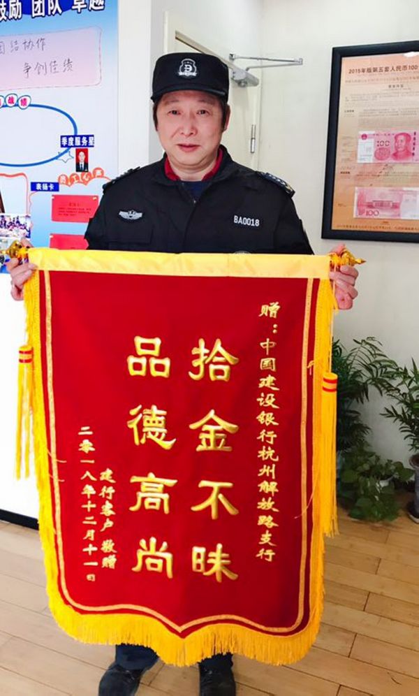 2018.12.17日我们收到一个快递,打开一看是一面锦旗,大家还在猜测是谁送的呢,这是咋回事呢?原来,12月11日早上8:58分左右,德邦保安公司驻建设银行解放路支行保安员陆志香和往常一样开启自助设备通道门后,对ATM的每一个自助设备进行巡查,突然在二号门的侧面缝隙中发现有一个卡封套,立即交给营运主管,打开一看,大概有7,8张购物卡,营运主管询问情况后随即查看监控并与后台集中清机负责人联系,查询流水后联系当事人,与客户进行核实,当事人回忆可能在存钱的时候不小心掉在了地上,而后被别人捡起后放在了缝隙中,在下午的17点左右,客户前来取回东西,并表示感谢。