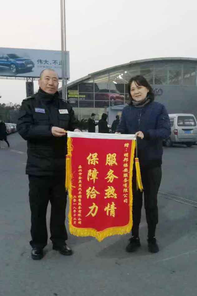 12月23日上午,公司收到嘉兴市金奥兰汽车销售有限公司负责人送来的一面锦旗。他们对保安员忠于职守,尽职尽责,维护单位安全的精神,予以感谢。在即将过去的2018年,嘉兴市金奥兰汽车销售有限公司保安班全体队员,在工作中始终围绕“大事不出,小事也不出”的安全理念,兢兢业业,任劳任怨,积极热情的维护客户安全,努力做好隐患排查、巡逻守护等安保工作,勤勤恳恳,认真履行自己的工作职责,受到了客户单位领导和员工的一致好评,树立起保安队伍的一面旗帜。