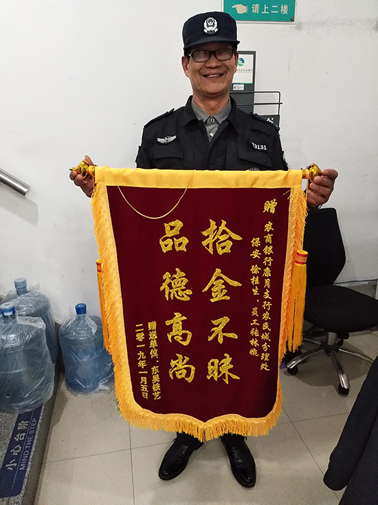 2019年1月7日,羊女士专程到富阳农商银行康月支行农民城分营业大厅,为保安元徐桂生送上了写有“拾金不昧,品德高尚”字样的锦旗。