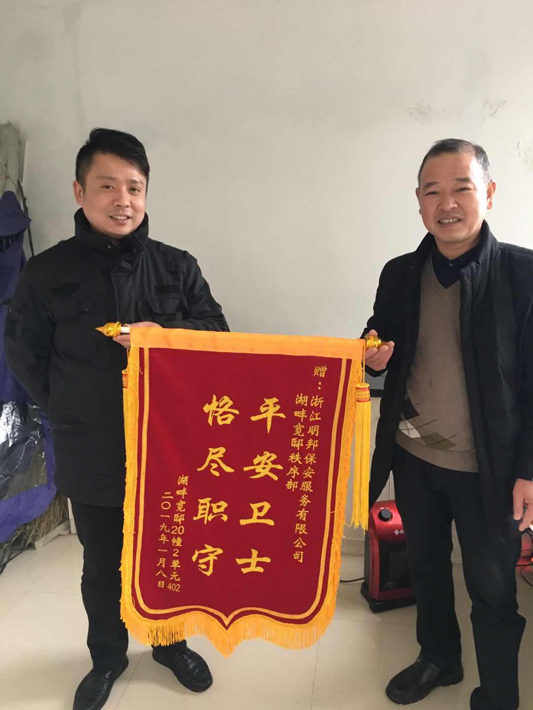 2019年1月7日,家住湖畔宽邸20幢2单元402业主王女士将一面写有“平安卫士 恪尽职守”字样的锦旗送到了保安室服务中心,衷心感谢保安队对其人身及财产安全的保护。 1月7日16时许,王女士回家恰遇一可疑男子在自家门口撬锁。可疑男子发现户主后迅速从楼道逃跑。马女士随即打电话联向保安寻求助。收到求助的保安队长立即组织保安对可疑男子进行围堵,并报警,同时嘱咐马女士保护好自身安全。最终,保安人员在楼道内成功将可疑男子堵截,并将其交予随后赶到的民警。为表达保安对自己人身及财产安全的保护,次日马女士特送锦旗表示感谢。