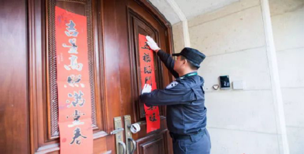 临近春节,部分业主离开杭州去全世界过年,小区变得越来越安静。但此刻的家园更要守护,巡逻时,杨刚刚有时会有逛一个人的景区的错觉。随着春节即将到来,杨刚刚和同事们开始用一些灯笼对联等饰品装扮小区,让春节的喜庆的气氛更浓一些。小区内还有几户法式别墅,业主暂未入住。杨刚刚春节前同样会为它们都贴上了春联,让小区有另一种喜庆与热闹。