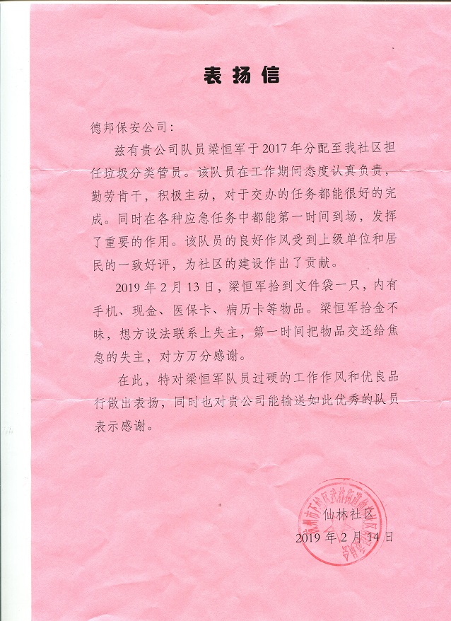 杭州仙林社区在获知这一件拾金不昧的好人好事之后,给德邦保安公司发来表扬信,既感谢好保安梁恒军对社区建设作出的贡献,也对培养出如此优秀队员的德邦保安公司表达了谢意。