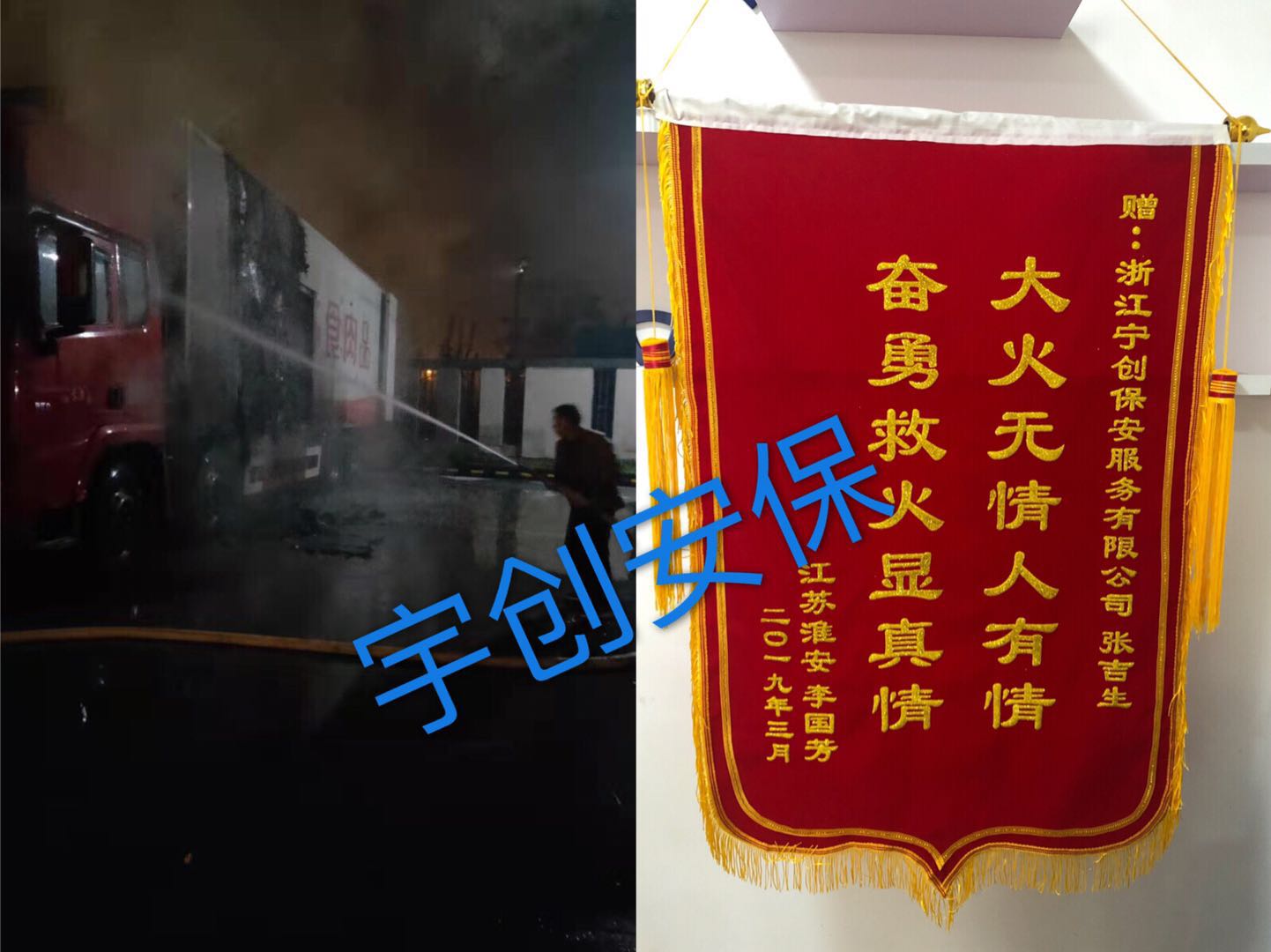 2019年3月2日凌晨2点55分,位于小洋坝农产品有限公司的物流停车场内,一辆装有农产品货物的物流车突然自燃,驾驶员还在驾驶室内熟睡。附近正在巡逻的宇创安保人员立马上前查看,并通知班长张吉生。班长立马组织实施应急方案,一边派人叫醒车内的驾驶员;一边组织人员打开消防栓和消防水带,扑灭火情。整个过程用时仅五分钟,不仅挽救了驾驶员的生命,也避免了其他车辆的财产损失和人员伤亡。