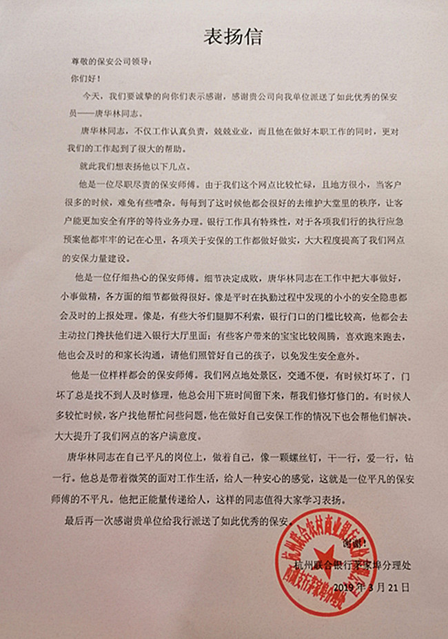 人们常说:“当保安很轻松的,看看门而已”。其实银行保安工作是非常枯燥乏味的,每天9至10小时的工作时间,在十几平方米的工作活动范围,要不厌其烦引导客户,维护好网点内外秩序,但是唐华林都能从容面对,对行动不便的老人来办业务,他会上前主动搀扶,如遇下雨天,他会主动撑伞,迎送客户,这些工作看似简单朴实,但却非常暖人心,多次受到业务客户的赞扬,在工作空余时,他还会为银行做一些力所能及的事,如更换一些不亮的日光灯,或维修一些桌椅、门窗等等,做到了爱岗如家,并得到了银行全体员工的一致认可,特此送来锦表扬信一封以予表扬。