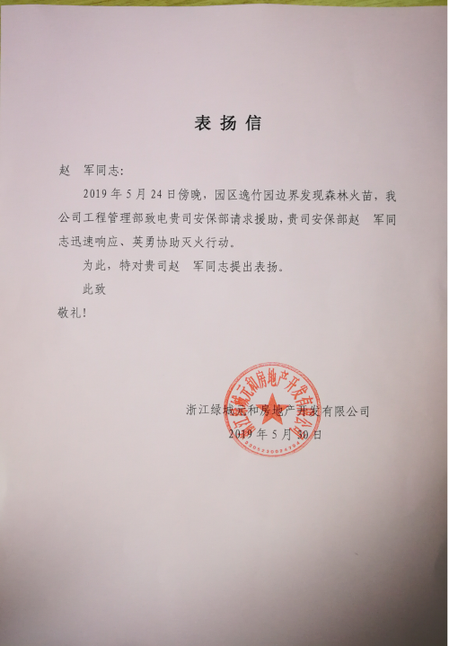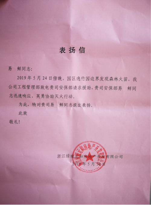 2019年5月24日傍晚,我司派驻安吉悦榕庄酒店周边突发森林火警。我司派驻保安员接到求助电话后,按消防应急预案快速启动,有序开展应急预案措施,在消防队到达现场前将明火基本扑灭并控制,为控制火情赢得了宝贵的时间。 我司派驻保安员反应迅速、应急预案措施开展得力,有效避免了一场森林火灾的发生,保护了业主与当地周边居民的人身财产安全,赢得了大家一致的认可和表扬。