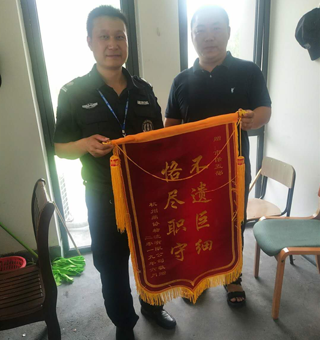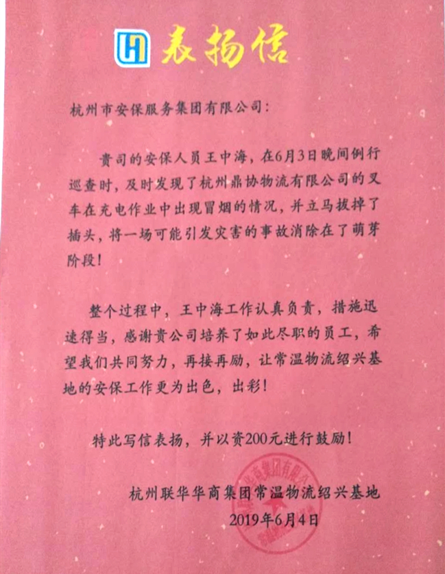 2019年6月3日21:00时,公司五部驻绍兴市柯桥区杨汛桥世纪联华配送中心保安队员王中海正常例行执行夜间巡逻时,巡逻到客户单位叉车充电间发现正在充电的叉车出现短路自燃的现象,立即拔掉电源插头,断其电源,并按照日常训练的处突流程,采取措施上报值班队长,避免了一场即将发生的安全事故,避免了客户单位的财物损失。杨汛桥世纪联华配送中心领导孙经理对此次安全事故处置高度认可,对公司安保队员王中海同志给予200元现金奖励,同时对公司安保人员的责任心和对突发事件迅速有效处置能力,特送上了“表扬锦旗”和“表扬信”以兹鼓励。