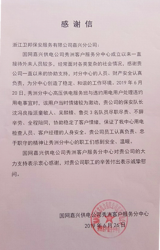 近日,浙江卫邦保安公司嘉兴分公司收到国网嘉兴供电公司秀洲客户服务分中心的感谢信,对童敏人、吴麟锋、鲁炎三名队员工作认真负责、忠于职守给予充分肯定。6月20日,三名队员协助客户服务分中心处理违约用电事宜时,尽职尽责、不辞辛劳、全程陪同,稳定了客户情绪,保证了中心用电检查人员、客户经理的人身安全。对此客户服务分中心称赞有这样优秀的保安员,为他们保驾护航,让他们满意放心。