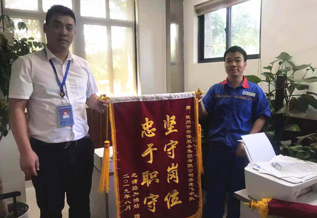 在“七一”、“八一”等重要节日期间,在近期高温酷暑期间,烟厂中队指派的保安队员在转塘区域加油站始终坚守岗位,恪尽职守,为加油站的安全维稳工作做出了贡献,连续收到客户锦旗表示感谢。