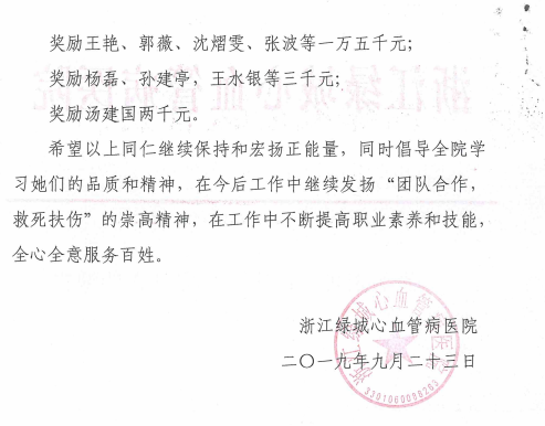 本次事件获得了央视(CCTV13)新闻、人民日报、都市快报、青年时报和今日头条、百度网、阿里巴巴正能量网等主流媒体报道,获得了广大市民的赞扬和肯定。绿城医院对我司两名保安队员杨磊、孙建亭予以通报表扬,授予最美“绿医人”特别奖,并奖励两人各三千元人民币现金,同时,公司已下发通报,号召全体员工向杨磊和孙建亭通知学习,忠诚履行职责,做人民的忠诚卫士,为保一方平安做出更大的贡献。