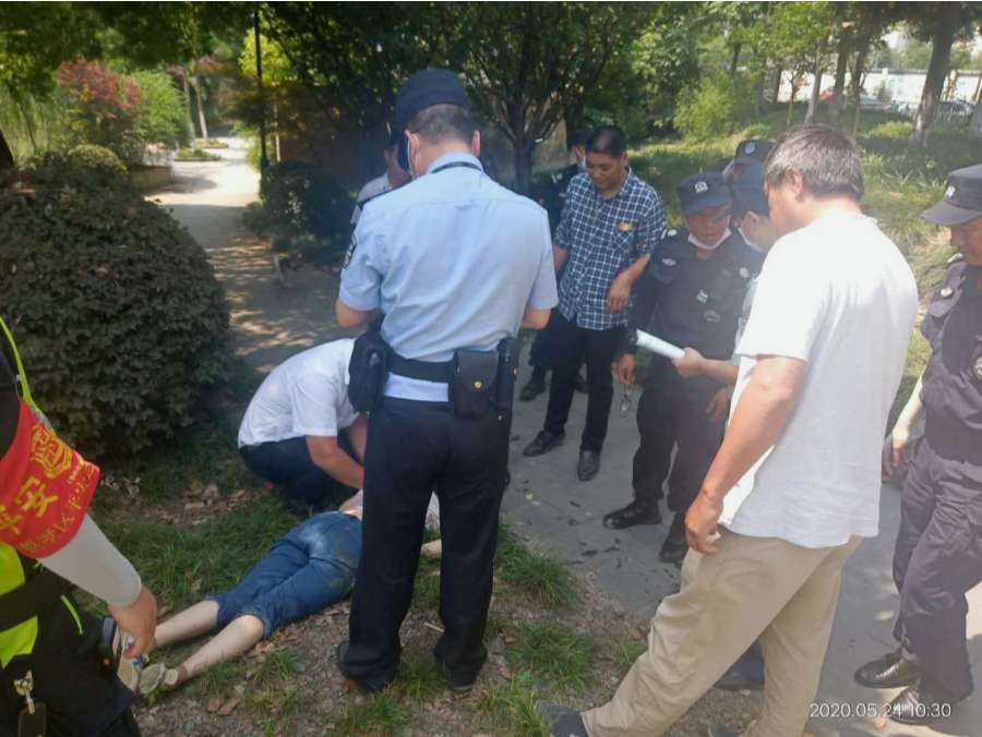 此时,保安队长、班长以及东区巡逻组队员都赶到了,组长舒建华立马拨打了110和120求助。队员宋成成和两位青年男子上前查看该女子心跳脉搏气息,进行清理口鼻开放气道、胸外按压心肺复苏等急救措施。