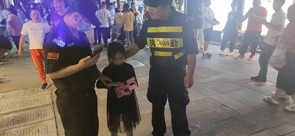 10月1日晚上7点16分,一队巡逻队正走到河坊街大井巷口附近,突然听到一阵哭泣声,闻声而去,原来是有个六七岁大的小女孩,由于人群十分拥挤,与家人走失了。队员们立刻一边安抚小女孩,一边向派出所汇报情况,由他们协助,一起寻找小女孩的家人。经过半个多小时的努力,终于找到了孩子的母亲。此时,孩子的母亲也已经是心急如焚,看到自己的女儿,立马跑上来一把搂住,然后对保安员们表示万分的感谢。队员们表示让家长以后一定要看好小朋友,不要再发生类似的事情。