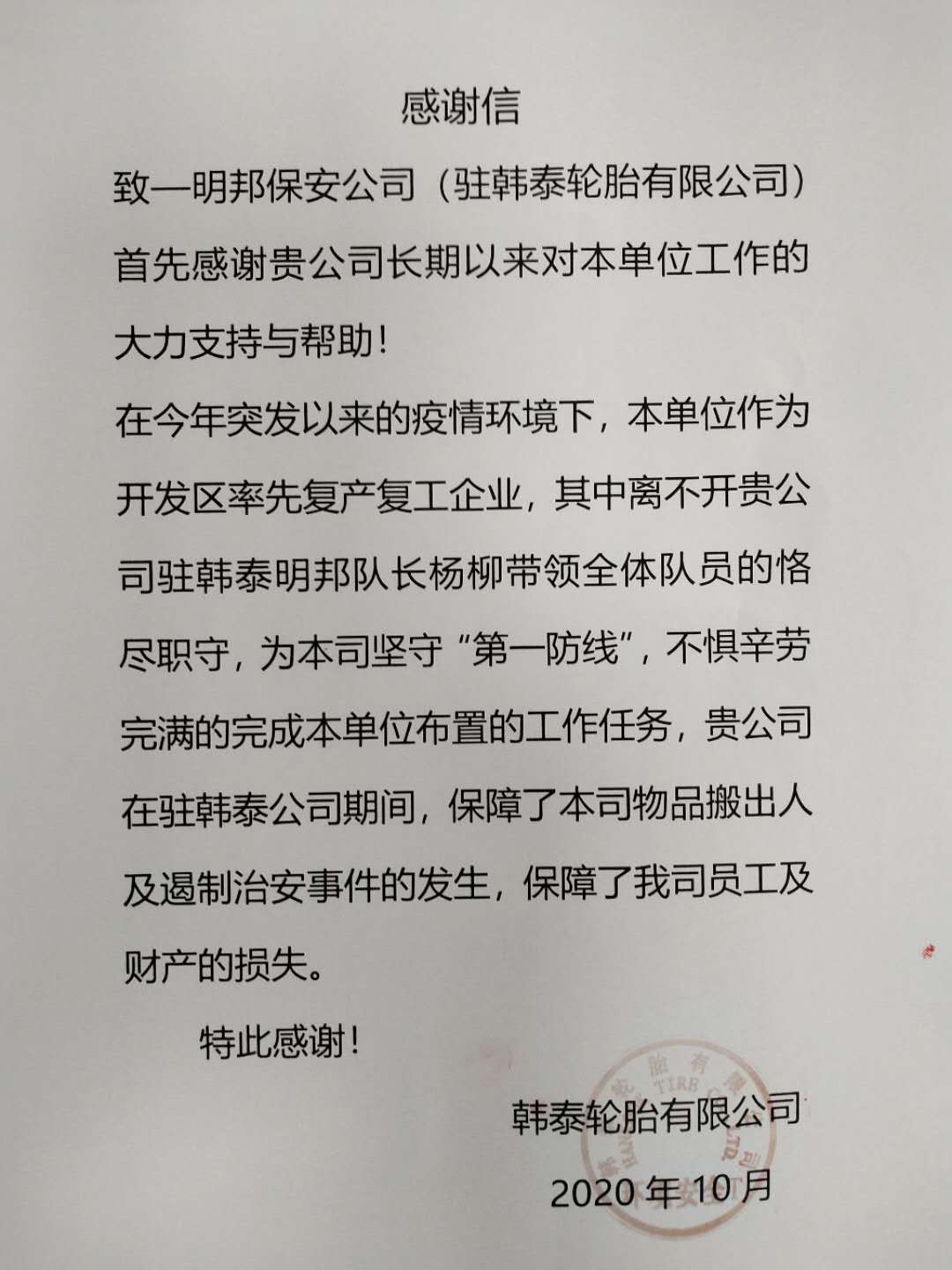 2020年10月30日收到明邦保安公司驻韩泰轮胎有限公司 的锦旗及表扬信,信中提到首先感谢明邦保安团队长期以来对客户单位工作的大力支持与帮助!
