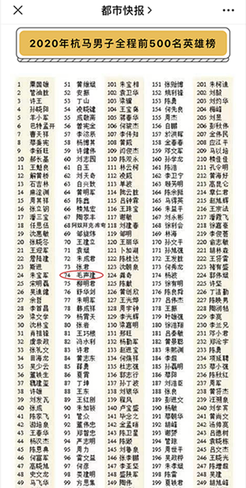 2020杭州万人马拉松于11月22日7时30分在武林广场开跑,浙江卫邦保安公司督察队长毛声建参赛挑战自我,经过顽强拼搏以2小时43分32秒(第74名)的优异成绩跑完全程,冲进英雄榜百强,他是保安队伍中的勇敢者。
